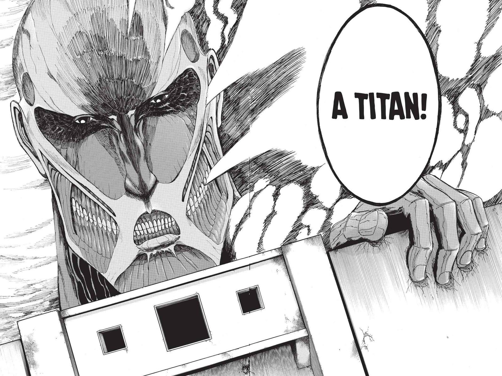 In this shot, the Colossal Titan appears for the first time over the walls, bringing death to Shinganshina.