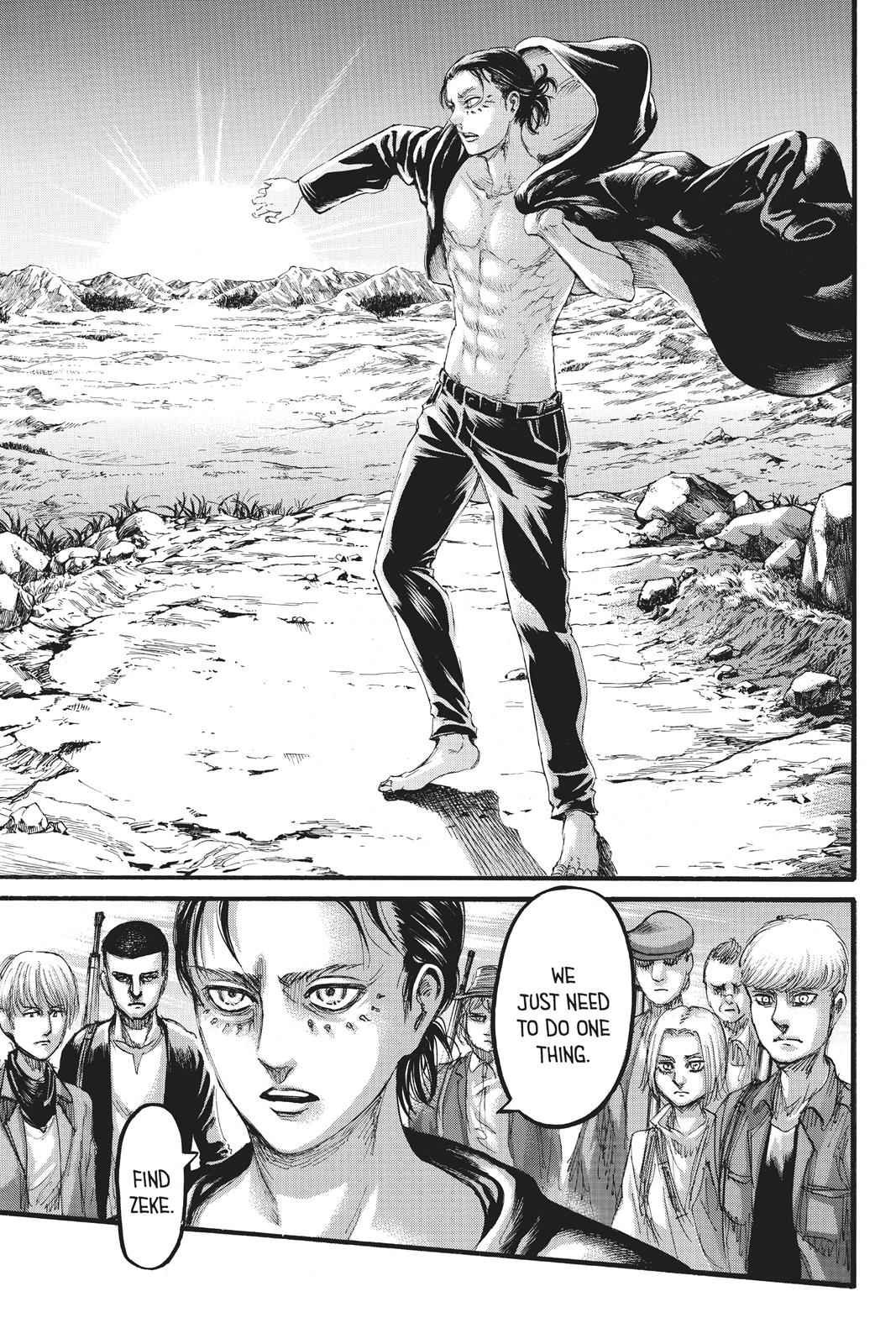 In this shot, after escaping prison, Eren and his followers are determined to find Zeke to end the war.