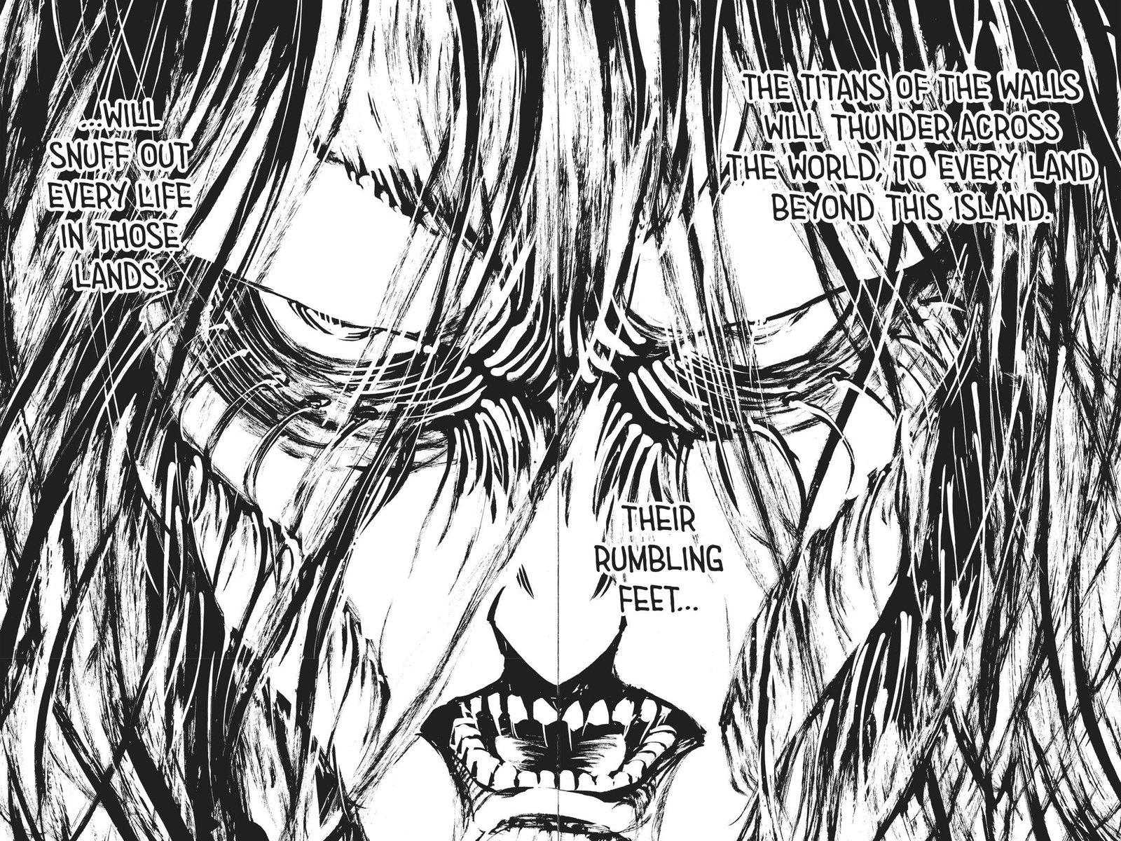In this shot, Eren talks from the founding titan to all Eldians all over the world, he tells them he destroyed the walls and the rumbling has started.
