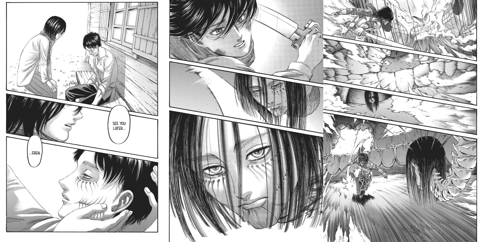 The controverted final of the story, While Armin fights Eren, Mikasa finds a way to break into his mouth and put an end to the war.