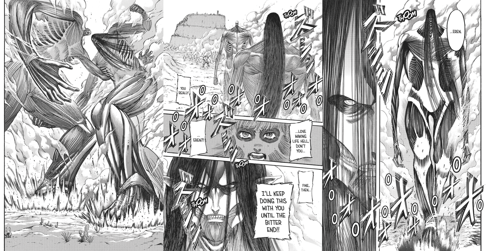 In this shot, the Colossal Titan appears for the second time in the Trost district, but this time Eren would face him.
