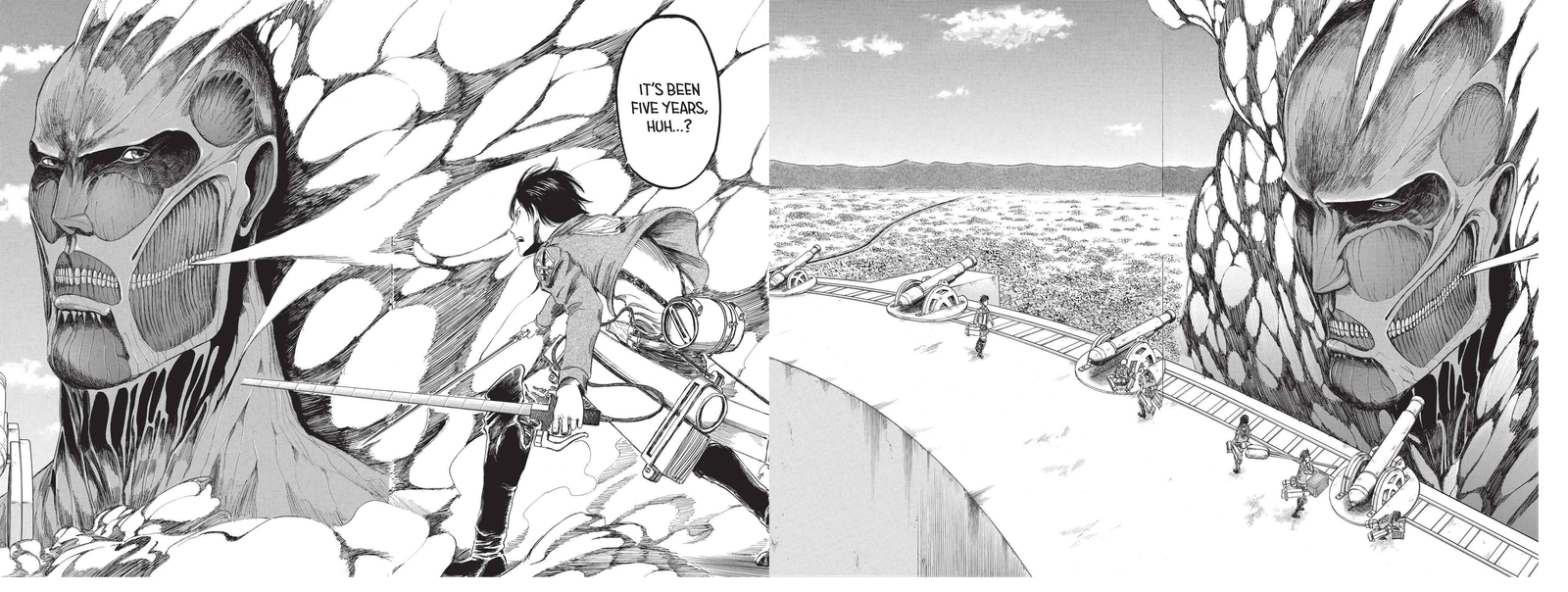 In this shot, the Colossal Titan appears for the second time in the Trost district, but this time Eren would face him.