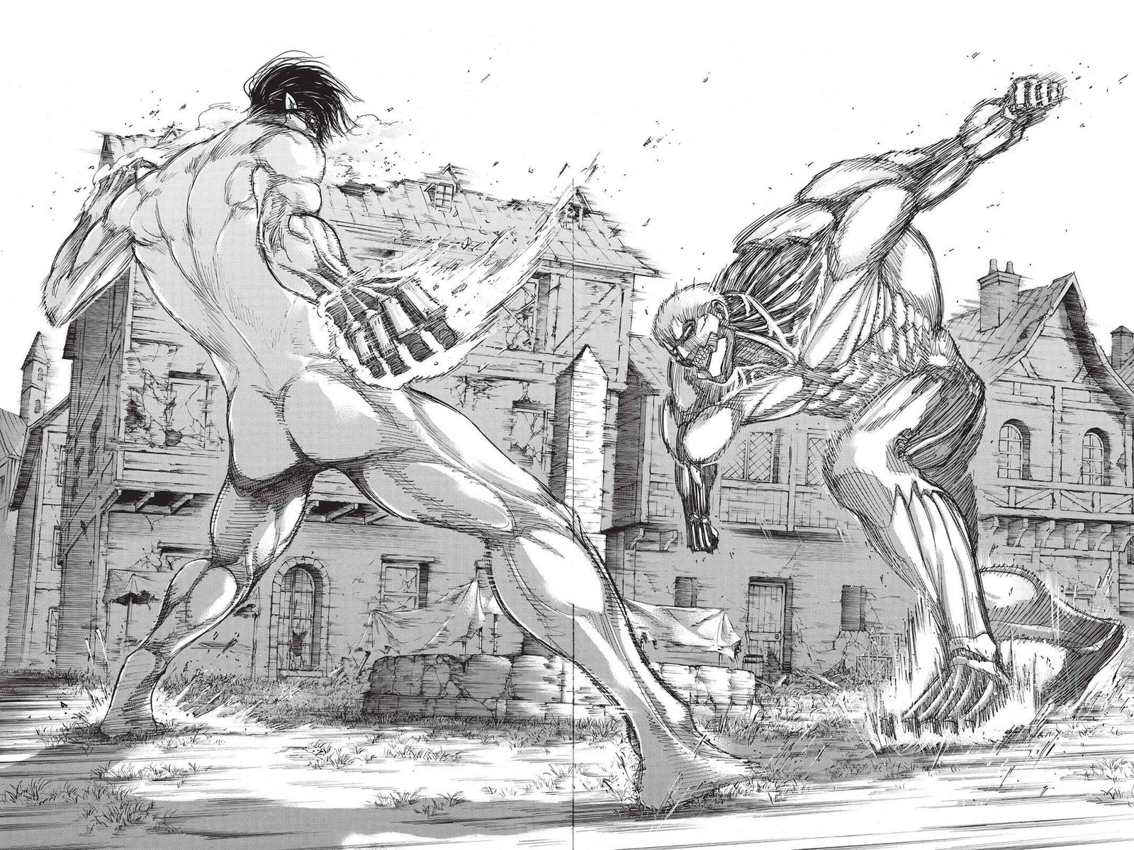 Eren fights Reiner in the Shinganshina district.